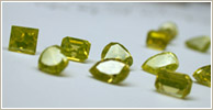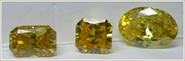 Type Ia diamonds change their brown colours at HP – HT – treatment to bright yellow – green colours of different tones and saturations. Cause of this is the generation of different colour centres fixed to nitrogen, so called VN complexes, vacancies (V = vacancy) and nitrogen atoms in certain arrangements. They generate partly by catching of vacancies by a nitrogen pair (A - centre with absorption maximum in IR at a wave number of 1282 cm-1) to a H3 – centre (one aggregate and one (or two) neutral vacancies) with an absorption at 503 nm, or by an B – aggregate (B = 4 N – atoms at the edges of an tetrahedron with central vacancy, IR – absorption maximum at 1175 cm-1) to a H4-centre with an absorption at 496 nm. Further VN - complexes are the N3 and N2 named colour centres, triangular arrangements of three nitrogen atoms with neutral or negative charged vacancy, with absorption at 415 nm resp. 478 nm, NVo- resp. NV--centres (always one N-atom with one neutral resp. negative vacancy), with absorption at 575 nm resp. 637 nm, as well as the H2-centres, though with analogous configurations as the H3-centre, but in negative charged state, with absorption in the near infrared at 986 nm and resonances up to the visible region. The last mentioned centres can be generated from the dissociation of the A- or B-aggregates as the disintegration of platelets. The colours generate then from the different proportions of the colour centres and their corresponding absorption bonds and possibly further optical effects, often the cause of it is not yet clear.